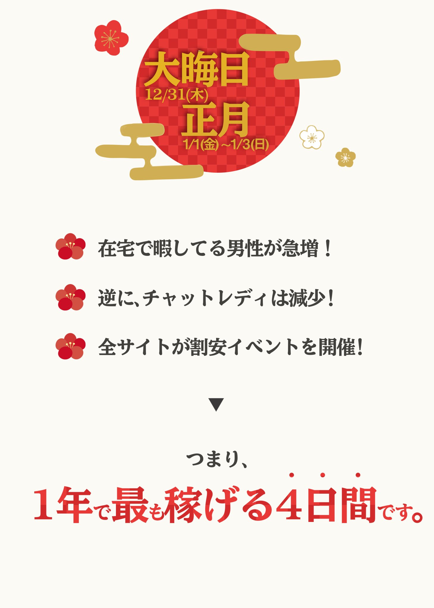「大晦日の12月31日から正月の1月3日の4日間はチャットレディにとって最も稼げる4日間」なのです。